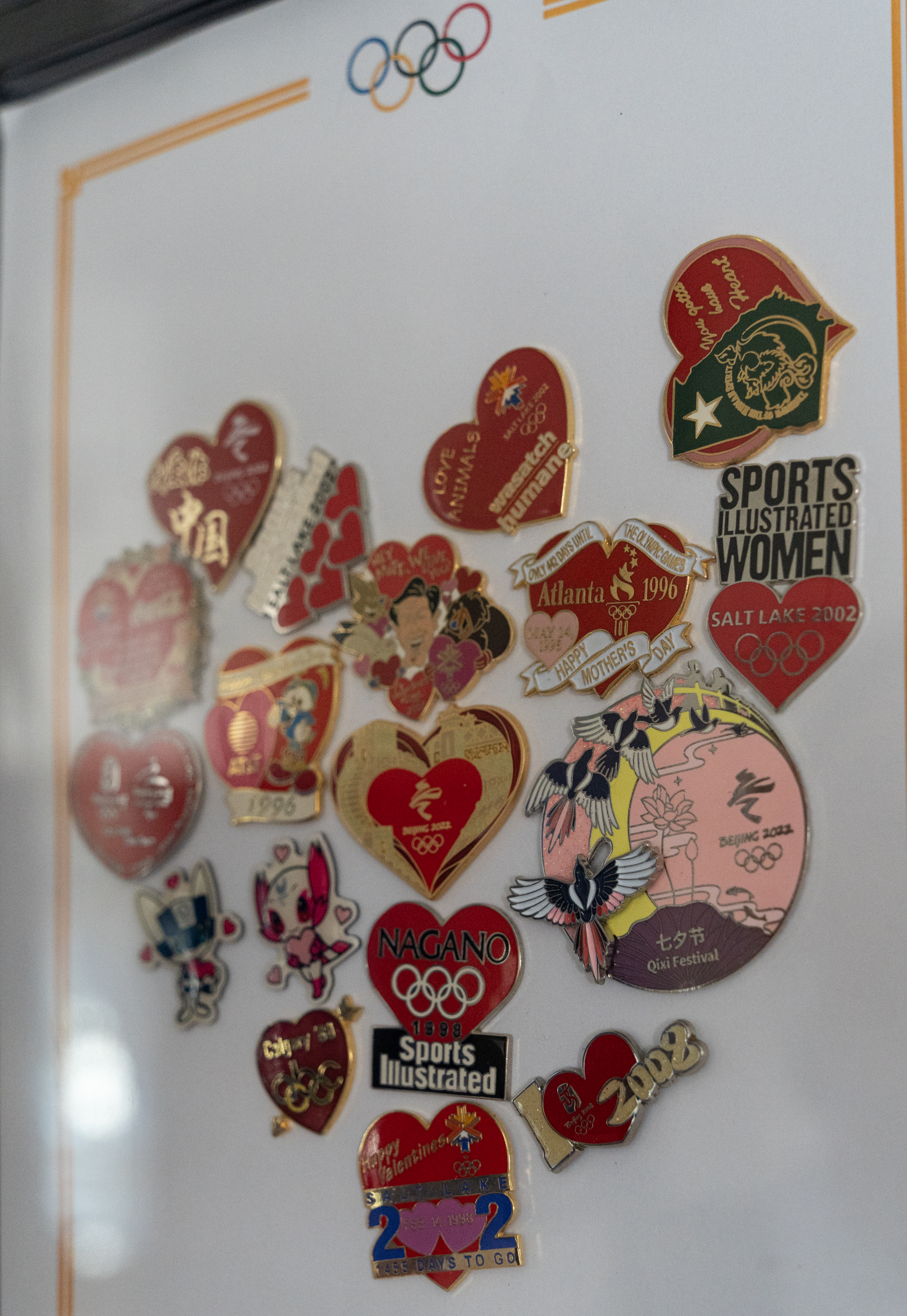 “我们这次带来的徽章藏品由国内60位藏友提供,带来了大概5000枚徽章,这些徽章都来自历届奥运会和冬奥会,当然北京冬奥会相关的徽章在里面占了大部分。我们展览是以主题分类,比如这个情人节主题的徽章就广受大家喜爱。还有咱们北京冬奥会场馆主题的,这位藏友别出心裁地在每一个场馆前打卡,然后用照片和徽章做成一组比较有意思的展。”王舒说。